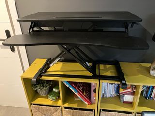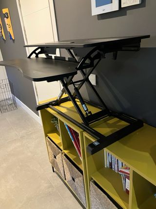 Vendo por viaje, esta en perfecto Estado. Es muy útil para cambiar de postura. Es ideal para teletrabajar. Precio nuevo 80€ Convertidor de escritorio elevable para trabajar de pie o sentado. Superficie amplia para tu equipo. - Medidas: 65 x 45 cm. - Estructura plegable de tijera. - Bandeja para teclado extraíble.