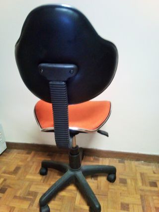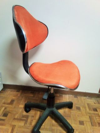 Sillón de despacho. Silla de oficina o escritorio giratoria elevable en altura. Con cinco ruedas. Nueva, en buenísimas condiciones. Color naranja y con adornos plateados alrededor Se vende en Madrid