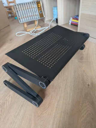 Mesa elevadora de aluminio para portátil, ideal para usar en mesa escritorio, cama o sofá. Tiene tres articulaciones por brazo para ajustar a lo que más se necesite. Si se guarda con las patas plegadas ocupa muy poco. - Material: Aluminio. - Color: Negro. - Patas ajustables y plegables.