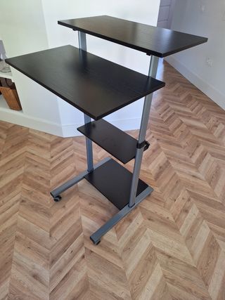 Mesa para trabajar sentado o de pie. Altura fácilmente ajustable. Tiene ruedas y freno para evitar su desplazamiento. Esta nueva. Permite colocar la pantalla en una altura y el teclado en otra. Perfecta para tener videollamadas de pie y evitar estar muchas horas sentado. Precio original €110