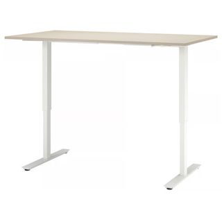 Escritorio moderno con superficie en tono beige y patas blancas. - Altura ajustable para trabajar de pie o sentado. - Diseño elegante y funcional.