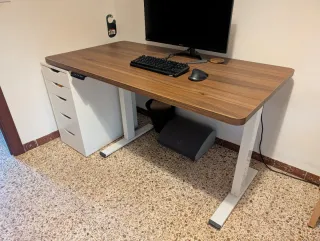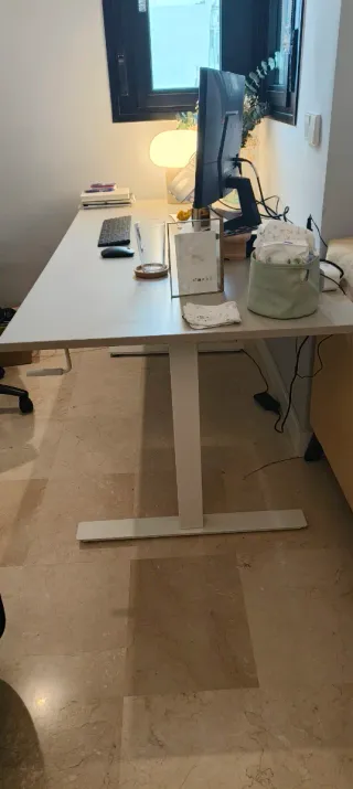 Vendo escritorio elevable eléctrico en perfecto estado. Tablero de madera natural con acabado cálido y patas metálicas blancas, muy estable y robusto. Ideal para trabajar sentado o de pie. Cuenta con motor eléctrico silencioso y panel de control con memoria de alturas, muy cómodo para cambiar de posición durante la jornada. Medidas: • Largo: 160 cm • Ancho: 60 cm • Altura regulable eléctricamente Muy cuidado, sin golpes ni desperfectos importantes. Perfecto para despacho, estudio o home office. Se vende por cambio de espacio. Recogida en mano.