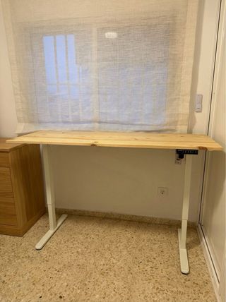 Mesa de escritorio elevable en perfecto estado, muy cuidada. Con 2 enchufes y con 2 usb. También con 4 presets de alturas. - Estructura de metal resistente. - Tablero de madera con acabado natural.