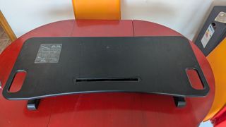 Mesa adaptable para trabajar de pie o sentado (puede subirse o bajarse). Su diseño permite ajustar la altura fácilmente. - Superficie lisa y resistente. - Asa integrada para facilitar el transporte. - Ranura para cables. En muy buen estado