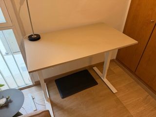 Escritorio elevable de IKEA en color beige. Permite ajustar la altura para trabajar de pie o sentado. Puede ver la mesa en mi domicilio. Si le gusta y realiza un depósito, puedo llevársela a su casa. - Estructura metálica y de plástico. - Diseño moderno y funcional.