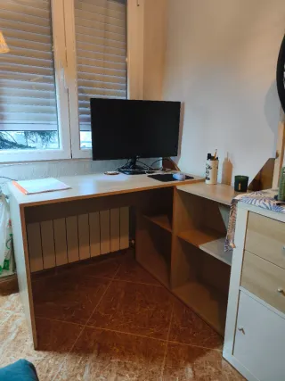 Mesa escritorio esquinera ideal para colocar en esquinas o rincones con pilar/columna, perfecta para aprovechar espacios pequeños en casa u oficina. Su forma encaja alrededor de un pilar, por lo que es muy útil en habitaciones complicadas donde una mesa normal no cabe. 👉 Perfecta como: - Mesa de estudio - Escritorio de oficina - Teletrabajo - Habitación juvenil - Despacho pequeño Características: ✔ Diseño esquinero / rinconera ✔ Adaptada para salvar columna o pilar ✔ Cómo nueva Medidas en la segunda imagen adjunta. El precio indicado es para recogida en mano y sin desmontar, habria que desmontarla. Precio no negociable