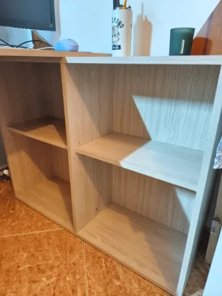Conjunto de escritorio esquinero con estanterías y cajonera. - Estructura de madera. - Diseño de esquina que optimiza el espacio. - Múltiples baldas para almacenamiento. - Cajonera integrada. El precio es por todo el pack, estantería incluida.