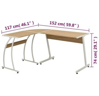 Escritorio esquinero con un diseño moderno y funcional. - Superficie de madera en tono natural. - Estructura de metal blanco. - Forma de L para optimizar el espacio.