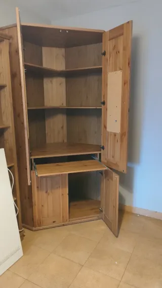 Mueble esquinero con espacio de escritorio integrado. Ideal para optimizar el espacio en cualquier rincón. - Diseño funcional. - Acabado en madera natural. Medidas exactas en última foto, al ser esquinero no coincide del todo con las dimensiones del anuncio. IMPORTANTE!! Si te interesa tendrás que venir a por él, desmontarlo (si consideras) y transportarlo por tu cuenta. Gran tamaño!