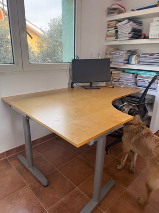 Vendo escritorio de pie (sit-stand desk) motorizado de la marca FEZIBO, diseño en forma de L (esquinero). Fue comprado en Amazon por aproximadamente 360 € y se encuentra en excelente estado. Características técnicas: • Sistema eléctrico: Equipado con motores potentes para una elevación suave y silenciosa. • Panel de control inteligente: Incluye controlador con pantalla y 4 ajustes de memoria (botones 1, 2, 3 y S) para guardar tus alturas favoritas. • Diseño ergonómico: Forma de L que aprovecha al máximo el espacio de la esquina. Acabado en madera rústica con estructura negra muy robusta.