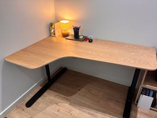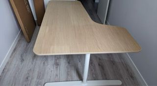Mesa de escritorio esquinera izquierda Bekant en chapa de roble, con altura regulable 65‑85 cm. • Dimensiones: Ancho 160 cm / Fondo parte ancha 110 cm / Fondo parte estrecha 60 cm • Estado: Buen estado general, solo un golpe en la parte trasera del tablero (no visible si se coloca contra la pared). • Se entrega desmontada y lista para recoger en Getafe Centro. • No envío, recogida en persona. Perfecta para home office o despacho, pieza descatalogada y muy demandada. Precio: 180 € (negociable dentro de límites razonables).