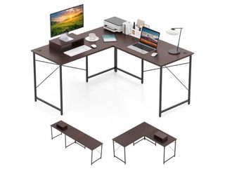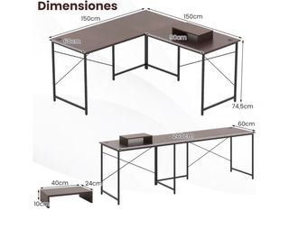 Escritorio en forma de L, ideal para optimizar el espacio en tu hogar u oficina. Su diseño combina a la perfección con cualquier decoración. - Superficie de madera con acabado en tono marrón. - Estructura de metal resistente en color negro. - Diseño en L para mayor versatilidad.