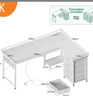 Escritorio en L de la marca ODK, con un diseño moderno y funcional. - Color blanco. - Estructura de metal y superficie de madera. - Incluye cajones para almacenamiento. - Diseño reversible. - Entregar en persona. - Ver sin compromiso.