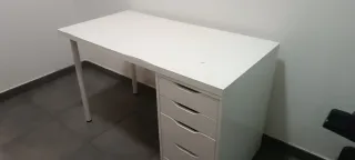 Escritorio moderno de Ikea, modelo Lagkapten Alex. - Diseño limpio y funcional. - Amplia superficie de trabajo. - Cajonera integrada para almacenamiento. Tiene ligeros signos de uso en algunos filos y una pequeña marca (se ve todo en las fotos)
