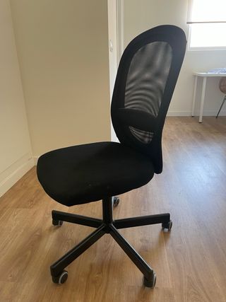 Silla de escritorio modelo Flintan de Ikea. Su diseño ergonómico y materiales la hacen una opción práctica para tu espacio de trabajo. - Respaldo de malla transpirable. - Base con ruedas para fácil movilidad. - Asiento acolchado para mayor comodidad.