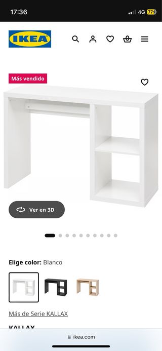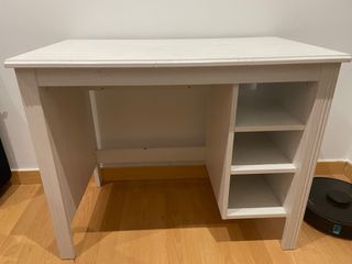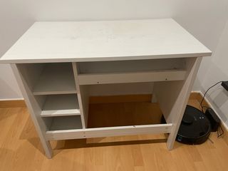Escritorio de madera de Ikea en color blanco. Cuenta con un diseño funcional y práctico. - Amplia superficie de trabajo. - Compartimentos de almacenaje abiertos. - es una mesa fuerte Se ha usado como tocador y está algo manchado en la superficie. También tiene algún desperfecto que se muestran en foto