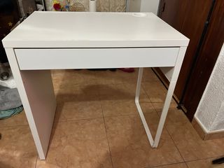 Escritorio de Ikea modelo Micke. Está en perfecto estado, apenas usada. Le hemos comprado otra mas grande y esta no la ha utilizado apenas. Tiene un orificio en la mesa para poder poner los cables a traves de ahi para la lampara, el ordenador, etc. Tiene también un cajón integrado para almacenamiento. Medidas: Alto 75cm Fondo 50cm Largo 73cm La mesa está montada asique seria para recogerla en nuestro domicilio.