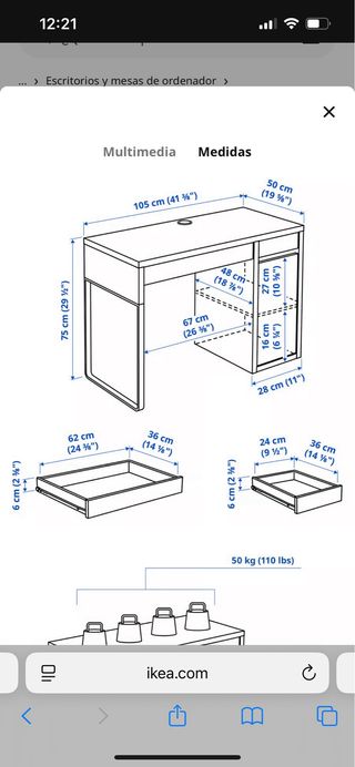 Escritorio moderno y funcional con un diseño limpio. - Amplia superficie de trabajo. - Cajones integrados para almacenamiento. - Patas metálicas resistentes. Tablero/ Hoja del lateral/ Lámina inferior: Tablero de partículas, Tablero de fibras y de partículas con relleno de papel alveolado (100 % papel reciclado), Tablero de fibras, Pintura acrílica, Borde de plástico, Borde de plástico Pata de apoyo: Tablero de fibras Medidas Peso máximo: 50 kg Peso máximo/cajón: 3 kg Ancho: 142 cm Fondo: 50 cm Altura: 75 cm Altura: espacio bajo el mueble: 63 cm Ancho de cajón (int): 62 cm Fondo de cajón (int): 36 cm Precio en ikea 89,99