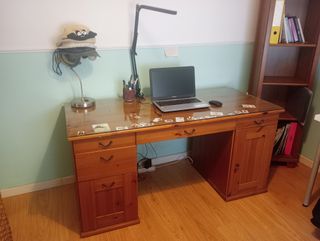 Conjunto de escritorio, Librería con puertas de cristal de 70x21x110. La mesa incluye el cristal de protección que tiene encima. Mesa de 151x65 de ancho y 74 de profundidad.