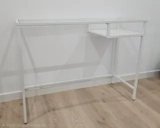 Elegante escritorio con estructura metálica blanca y superficie de cristal. - Diseño moderno y minimalista. - Estrecho, perfecto si no tienes mucho espacio - Incluye una práctica balda lateral. Precio no negociable