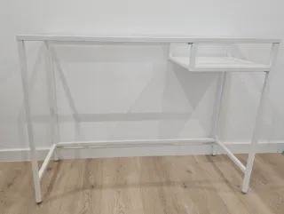 Práctico escritorio de Ikea en color blanco. Ideal para espacios de estudio o trabajo. - Estructura de metal y madera. - Incorpora un orificio para pasar cables.