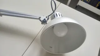 Lámpara de lectura con pinza de la marca Ikea. Ideal para colocar en escritorios, mesitas de noche o estanterías. - Diseño flexible y orientable. - Pinza resistente para sujetar firmemente. - Cable de alimentación incluido.