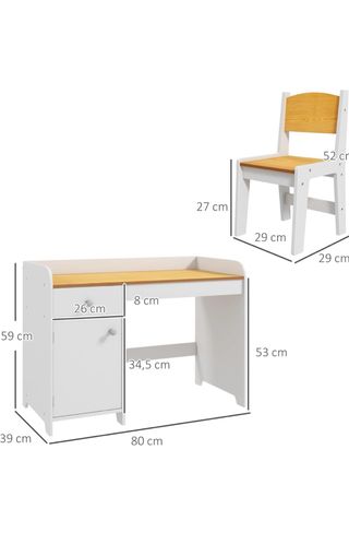 Conjunto de escritorio y silla de madera diseñado para niños. La superficie está desgastada, pero con una mano de pintura estaría perfecta. 📏 Medidas: 70cm ancho, 48 profundidad, 64 alto ❗️Importante: Le falta una tuerca y esto hace que se salga el tornillo provisional que le he puesto. Se arregla poniendo el tornillo/tuerca necesaria.