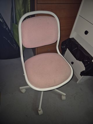 Silla de escritorio infantil con un diseño moderno y cómodo. - Estructura metálica blanca. - Asiento y respaldo acolchados en tela rosa. - Base con ruedas para fácil movilidad. La vendo en 20€, su precio original es de 59€.