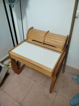 Vendo escritorio y silla infantil usado con look retro. A nuestra hija le encanta. Tiene algunas manchas de madera y faltan 2 tornillos, pero se puede usar perfectamente!