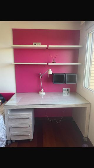 Conjunto de muebles para habitación infantil o juvenil. - Escritorio con superficie amplia. - Estantería con baldas. - Cajonera con varios cajones.