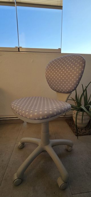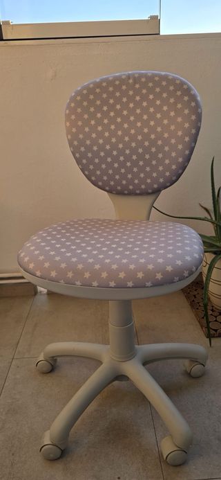 Silla de estudio con un diseño moderno y cómodo, ideal para habitaciones infantiles o juveniles. Su altura es ajustable para adaptarse a diferentes mesas. - Respaldo y asiento acolchados. - Base con ruedas para fácil movilidad. - Estructura de plástico resistente. tiene una pequeña mancha como ves en la foto