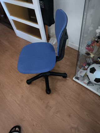 Silla infantil giratoria, ideal para escritorios. Es de color azul y tiene un diseño sencillo. - Tapizado de tela. - Base giratoria. - Ruedas para facilitar el movimiento. - Perfecta para niños.