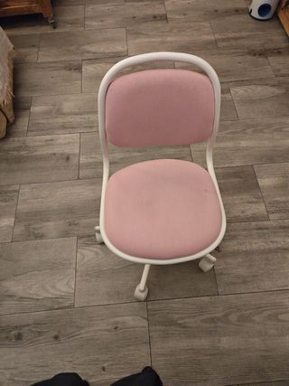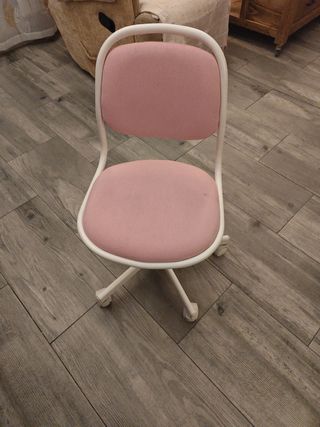 Silla de escritorio infantil de Ikea, ideal para habitaciones juveniles. Su diseño moderno y color rosa la hacen muy atractiva. - Estructura metálica blanca. - Asiento y respaldo acolchados en tela rosa. - Base giratoria con ruedas.