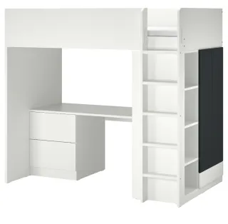 Conjunto de cama alta con escritorio integrado y armario. - Estructura blanca. - Escritorio espacioso. - Cajonera de dos cajones. - Escalera lateral. - Armario con puertas oscuras y estantes.