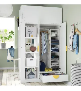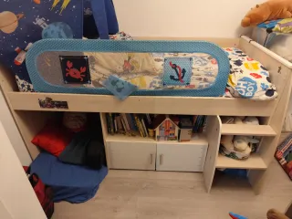 Dormitorio con cama nido de 90 (el somier de la cama de abajo está nuevo sin estrenar), escritorio, armario de 2 puertas, cajonera con estantería. Es convertible en maxicuna compacta con cambiador, cajonera frontal y lateral con cama nido abajo. Armario a juego de regalo. sd puede convertir en maxicuna opcional para usar con futuros hermanos o si aún es bebé