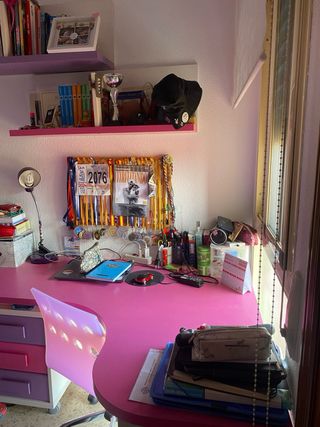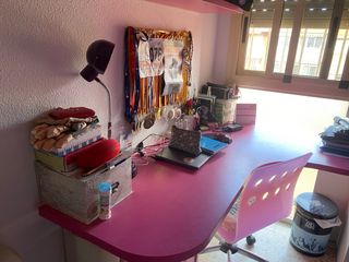 vendo muebles habitación niña, por cambio de cuarto. estan en perfecto estado, muy cuidados y sin roces. La cama tiene nido con colchón en la parte de abajo, los cajones del medio son grandes. EL COLCHON DE ARRIBA Y LA DECORACIÓN DE LA HABITACIÓN NO SE VENDEN. SÓLO LOS MUEBLES medidas cama: ancho 70cm; largo 190cm; altura 90cm medidas mueble alto: altura 122cm; ancho 40,5cm; fondo 77,2cm medidas escritorio: largo(del principio hasta la ventana) 150cm, (la parte de la ventana) 107,5cm; ancho 54,5cm; altura 75cm medidas estantes: ancho 91cm; altura 33cm; fondo 28cm medidas mueble pequeño: ancho 42,5cm; altura 60,5cm; fondo 40cm B.V.