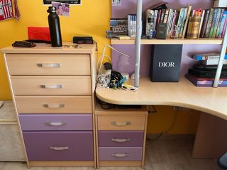 Mueble infantil de dos piezas: litera y escritorio. El escritorio tiene un diseño en esquina y varios cajones para guardar cosas. El conjunto está en buen estado y es ideal para una habitación infantil o juvenil. - Litera con estructura resistente. - Escritorio con superficie amplia. - Cajones espaciosos de colores.