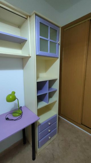 Conjunto de muebles de madera de calidad para habitación infantil o juvenil, ideal para estudiar y organizar. No incluye cama. - Escritorio con cajonera oculta (detrás de la cama en foto). Tiene recorte para ventana según croquis. - Armario con balda debajo. - Diseño moderno en tonos madera clara y morado. - Cajonera de 3 cajones opcional (30€) - Balda para pared a juego Ahora lo tenemos desmontado.