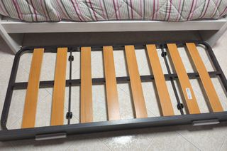 Cama nido compuesta por, escritorio, dos camas; La principal y debajo tiene otra que la puedes dejar a ras del suelo o a la misma altura que la otra. 90*2m y escritorio con cajonera(3 cajones y ruedas)