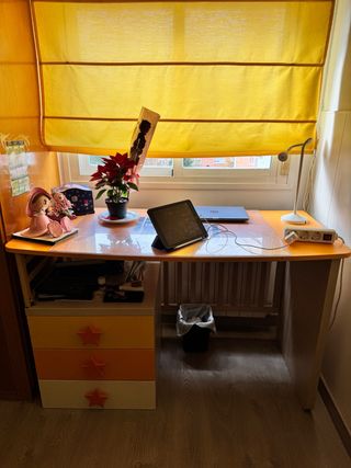 Escritorio juvenil con un diseño moderno y funcional. - Superficie amplia para estudiar o trabajar. - Cajones integrados para almacenamiento. - Combinación de colores vivos. Medidas: 2,70 de largo, 55 cm de ancho , 25 cm en la zona estrecha, tiene un zapatero incorporado, es muy juvenil , está en perfecto estado , es precioso mejor verlo, los cajones son muy espaciosos , y el zapatero perfecto para ahorrar sitio mucha capacidad , venta en persona