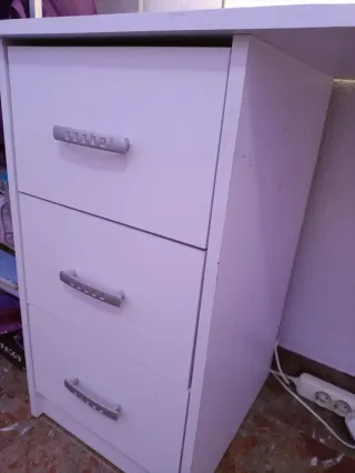 Escritorio blanco con cajones, ideal para un dormitorio. Tiene sus marcas de uso. -medidas: 120x45 - Tres cajones con tiradores metálicos. - Estructura de melamina. - Compartimento abierto lateral.