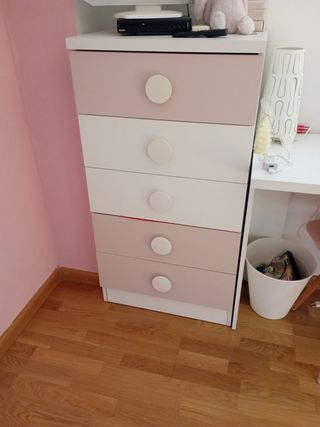 Dormitorio juvenil en rosa palo y blanco en perfecto estado. Mesa escritorio + estanteria + cama nido con cajones + cómoda + silla. Se regala uno de los colchones