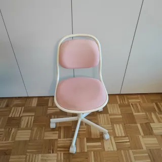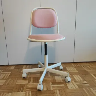 Silla de escritorio con un diseño moderno y acolchado en color rosa. - Estructura metálica blanca. - Base con ruedas para facilitar el movimiento. - Altura ajustable. - marca Ikea