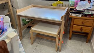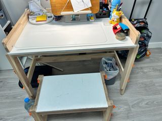 Mesa escritorio infantil FLISAT de IKEA, regulable en altura. Está poco dañado con algunas señales normales de uso. - Perfecta para niños y niñas. - Diseño sencillo y funcional. - Incluye una silla a juego.