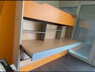 Cama litera infantil de color naranja y gris. Es para dos camas de 90x200 o 90x190. No incluyo colchones. Es compacta y práctica, ideal para habitaciones pequeñas. - Incluye escritorio integrado. - Dispone de estanterías para almacenamiento. - Cuenta con un cajón extraíble para guardar ropa u otros objetos. - Estructura en buen estado salvo algunos pequeños fallos en el escritorio tal y como se aprecia en las fotos. Desmontaje y traslado a cargo del comprador. Medidas: 2,45 de largo, 1,65 de alto y 1,05 de fondo. Ver más artículos en mi perfil.