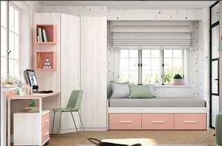 Se vende habitación juvenil en muy buen estado. Ideal para aprovechar el espacio. - Cama con cajones para almacenaje. - Escritorio. - Armario blanco con puertas rosas. - Estantería. - Silla de escritorio rosa. - Colchón bastante usado.