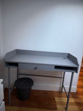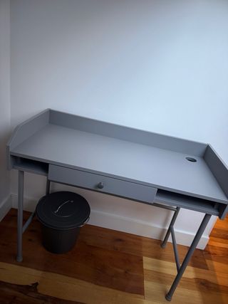Vendo escritorio IKEA de color gris en estado como nuevo. Diseño minimalista y muy funcional, ideal para estudio, oficina en casa o habitación juvenil. Cuenta con: • Cajón central espacioso • Superficie amplia de trabajo • Orificio para pasar cables • Estructura estable y resistente Siempre usado con cuidado, sin golpes ni desperfectos visibles. Se vende por cambio de mobiliario.