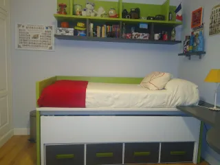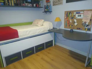 Se vende dormitorio juvenil en buen estado. Incluye cama con cajones, estantería y escritorio. - Cama individual con base de almacenamiento. - Estantería flotante con iluminación. - Escritorio a juego.