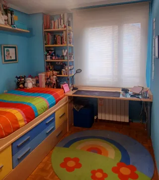 Se vende dormitorio juvenil completo, ideal para crear un espacio funcional y divertido. - Cama con cajones de gran capacidad. - Escritorio amplio. - Estantería. - Alfombra redonda con diseño de arcoíris y flores. - Decoración temática infantil. Se vende completo o por módulos.