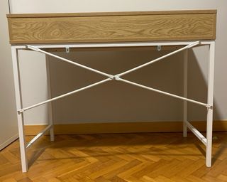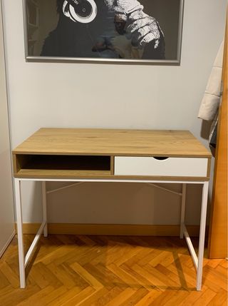 Escritorio completamente nuevo, sin uso. Se vende por cambio de planes. Diseño moderno en madera clara con estructura blanca. Incluye cajón amplio y balda inferior muy práctica. Perfecto para teletrabajo, estudio o habitación juvenil. Está impecable, como recién comprado.